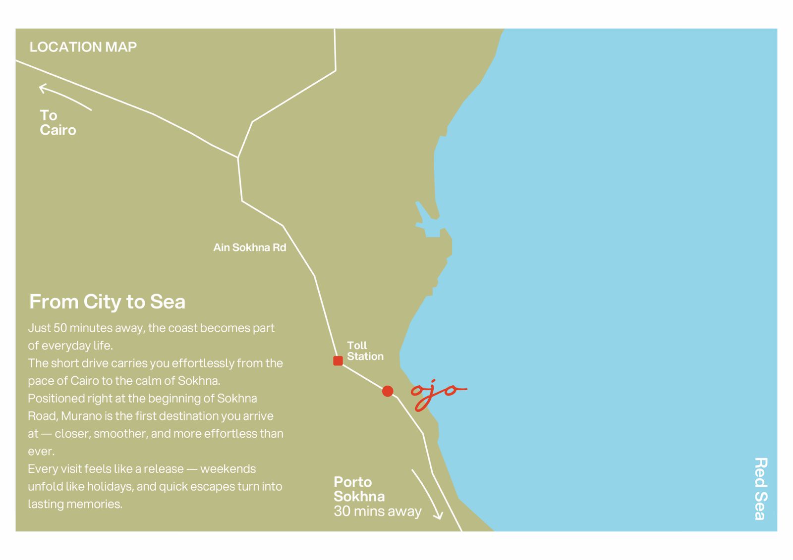 Only 50 minutes from Cairo, Ojo at Murano Ain Sokhna is your spontaneous coastal escape. Framed by the Red Sea and the mountains, Ojo brings you sandy beaches, vibrant lagoons, and family-friendly living — all designed for relaxation, connection, and unforgettable moments.